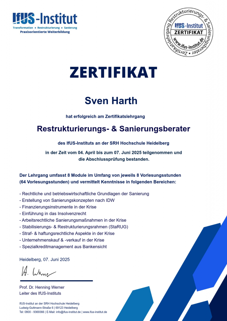Als zertifizierter Restrukturierungs- und Sanierungsberater (IFUS-Institut), begleite ich meine Mandaten auch durch schwierige Zeiten, mit dem Ziel, das Unternehmen aus der Krise zu führen. Durch den Zugriff auf ein großes Netzwerk von Partnern in der Beratung, können jeweilige Fachspezialisten wie Arbeitsrechtler, Insolvenzrechtler, Einkaufberater, Marketingberater, Vertriebsberater, mit in die zu bewätigenden Themen eingebunden werden. Mein Angebot: